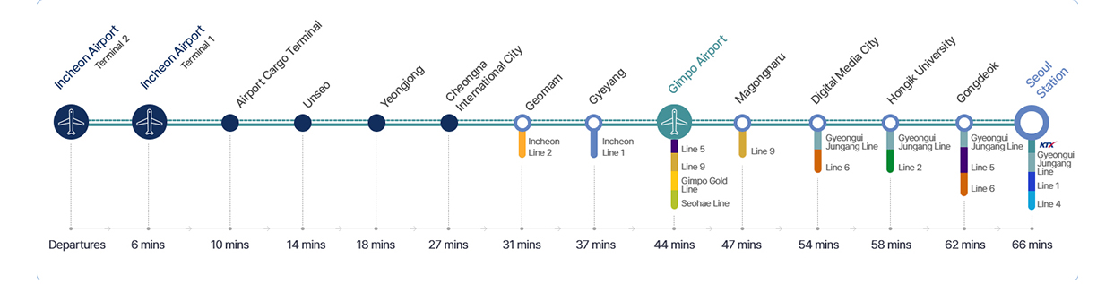 | Incheon Int’l Airport Stn. | Gimpo Int’l Airport Stn. | 05:35 | 00:41 | 50~60min | KRW 4,050 |