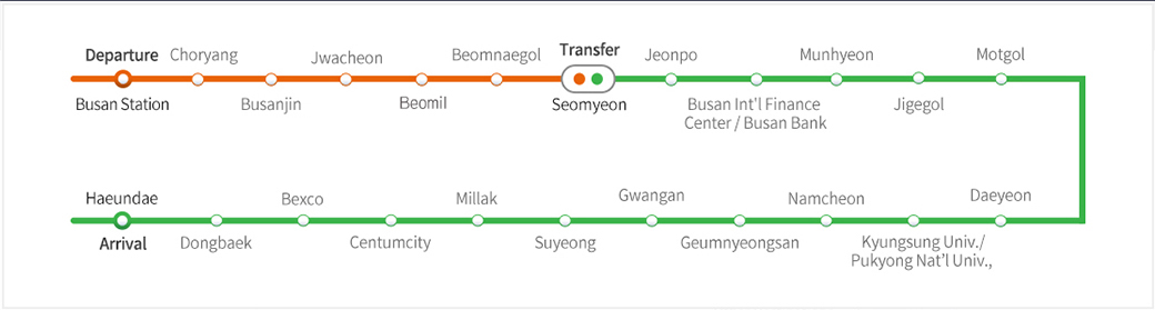| Busan Station | Haeundae Station | Busan Station (Line 1) → Seomyeon (Line 2) → Haeundae (Line 2) | 60 mins | KRW 1,650 |